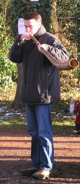A man sounding a Midwinter Horn. A local tradition in the weeks before Christmas.