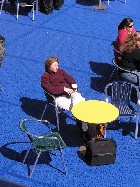 Elmine enjoying the sun and a coffee on the deck of the ferry from Denmark to Germany. Well deserved rest after three intense days in Copenhagen for the Reboot conference.
