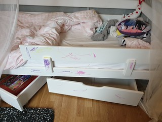 Today was the first time I had to be really cross with our little one. With a friend she had used a set of color markers to not just draw on the board intended for it, but everywhere else in her room as well. The door, the walls, the floor, lightswitches, all the furniture such as her bed including the sheets, the lamps and her piggy bank, the Sonos speaker, the toys in her room, and the poster frames on her wall. The door and the wall can’t be cleaned and will need a new coat of paint at some point. The rest luckily could be wiped clean quickly.